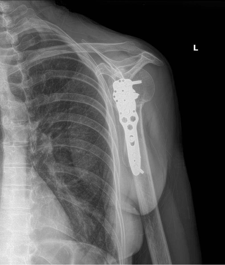 Unfortunately, over the next couple of weeks Mrs. A’s shoulder pain got worse. The doctor ordered more x-rays, which showed that the broken bone was now out of alignment. He informed Mrs. A that she would now need surgery to repair the fracture. She underwent the surgery, called an open reduction internal fixation surgery. It involved using a metal plate and screws to secure the fracture and correctly align it while it healed. Here are x-rays of her shoulder after the surgery: